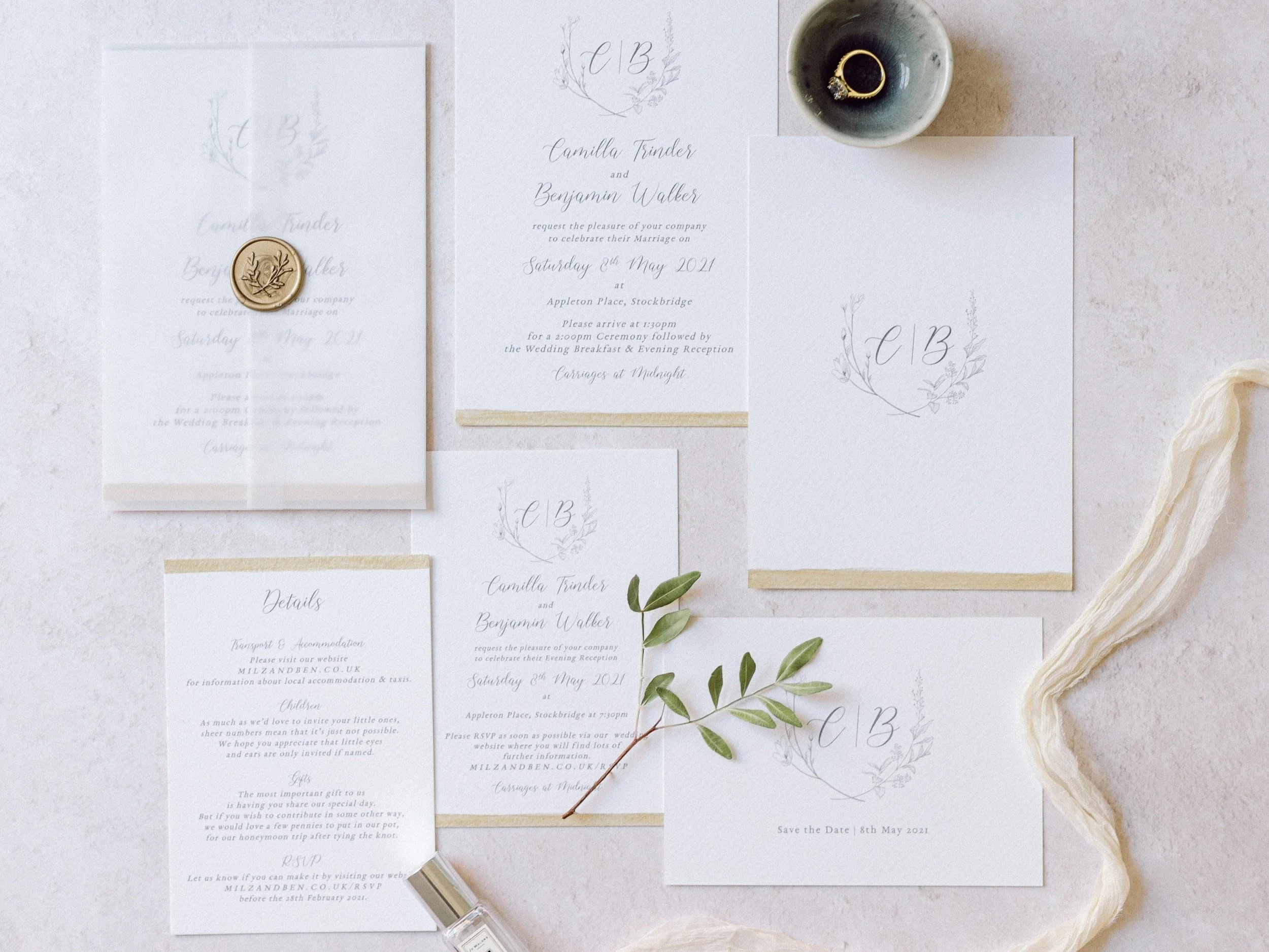 As standard this suite is created with 300GSM textured off-white Italian card, vellum touches and wax seals.